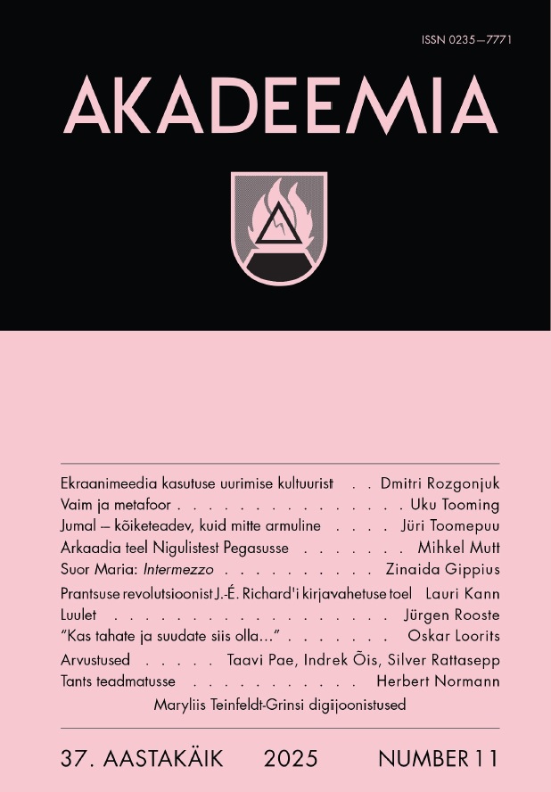 Alustuseks kaks teksti Peeter Tulviste mälestusfondi preemia laureaatidelt: ekraanimeediast kirjutab Dmitri Rozgonjuk ning vaimust ja metafoorist Uku Tooming. Jüri Toomepuu üllatab ateismiga, Mihkel Mutt kirjutab Juhan Viidingust. Rainis Toomemaa on tõlkinud Zinaida Gippiuse killu külaskäigust Lev Tolstoi juurde, Lauri Kann kirjutab Prantsuse revolutsioonist. Tänapäevakõlalised taastrükid on Oskar Looritsalt, luuletused Jürgen Roostelt, arvustustega esinevad Taavi Pae, Indrek Õis ja Silver Rattasepp. Jätkub ka Herbert Normanni päevik. Pildid on digijoonistanud Maryliis Teinfeldt-Grins.