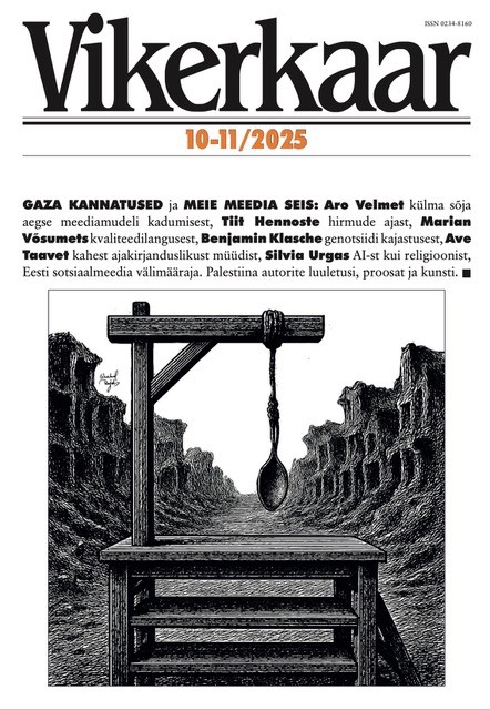 Gaza kannatused ja Eesti meedia seis. Aro Velmet külma sõja aegse meediamudeli kadumisest, Tiit Hennoste hirmude ajastust, Marian Võsumets : miks kvaliteet langeb? Benjamin Klasche genotsiidi kajastusest, Ave Taavet kahest ajakirjanduslikust müüdist, Silvia Urgas AI-st kui religioonist, Eesti sotsiaalmeedia välimääraja. Palestiina autorite luuletusi, proosat ja kunsti.